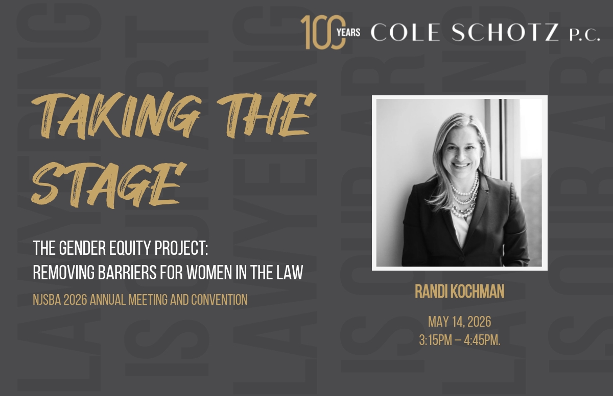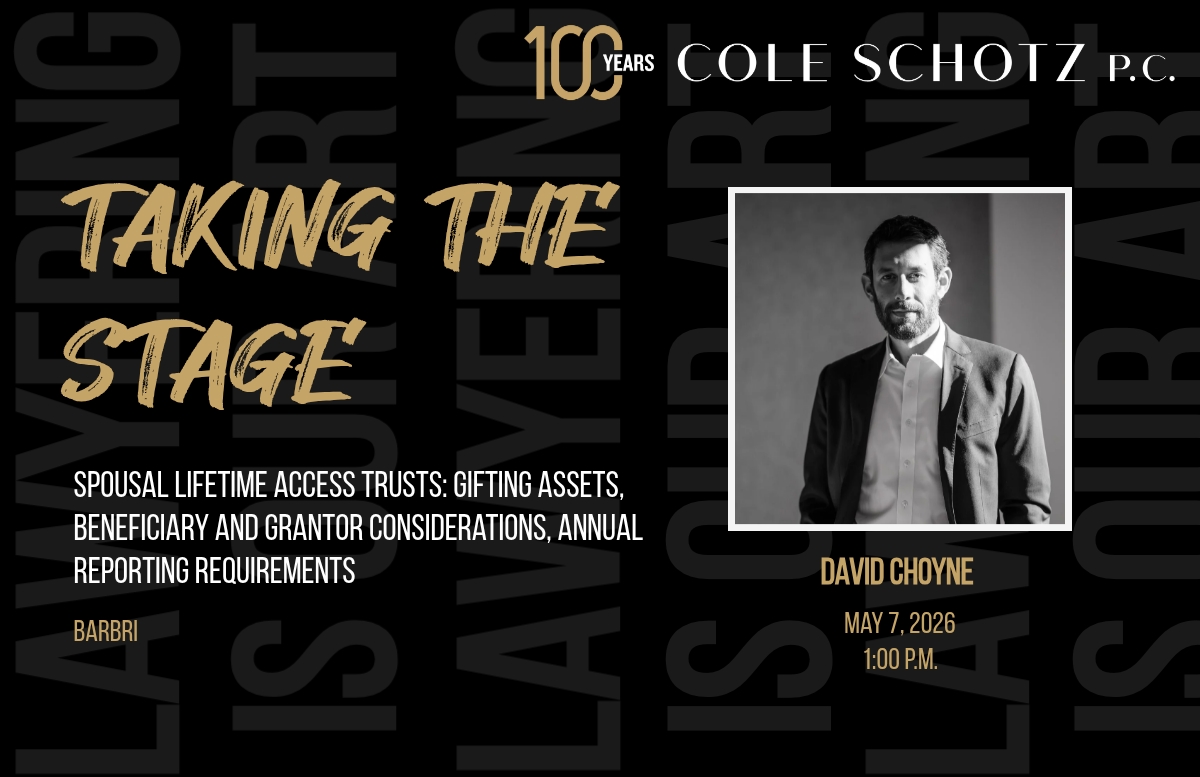As the law continues to evolve on these matters, please note that this article is current as of date and time of publication and may not reflect subsequent developments. The content and interpretation of the issues addressed herein is subject to change. Cole Schotz P.C. disclaims any and all liability with respect to actions taken or not taken based on any or all of the contents of this publication to the fullest extent permitted by law. This is for general informational purposes and does not constitute legal advice or create an attorney-client relationship. Do not act or refrain from acting upon the information contained in this publication without obtaining legal, financial and tax advice. For further information, please do not hesitate to reach out to your firm contact or to any of the attorneys listed in this publication. No aspect of this advertisement has been approved by the highest court in any state.