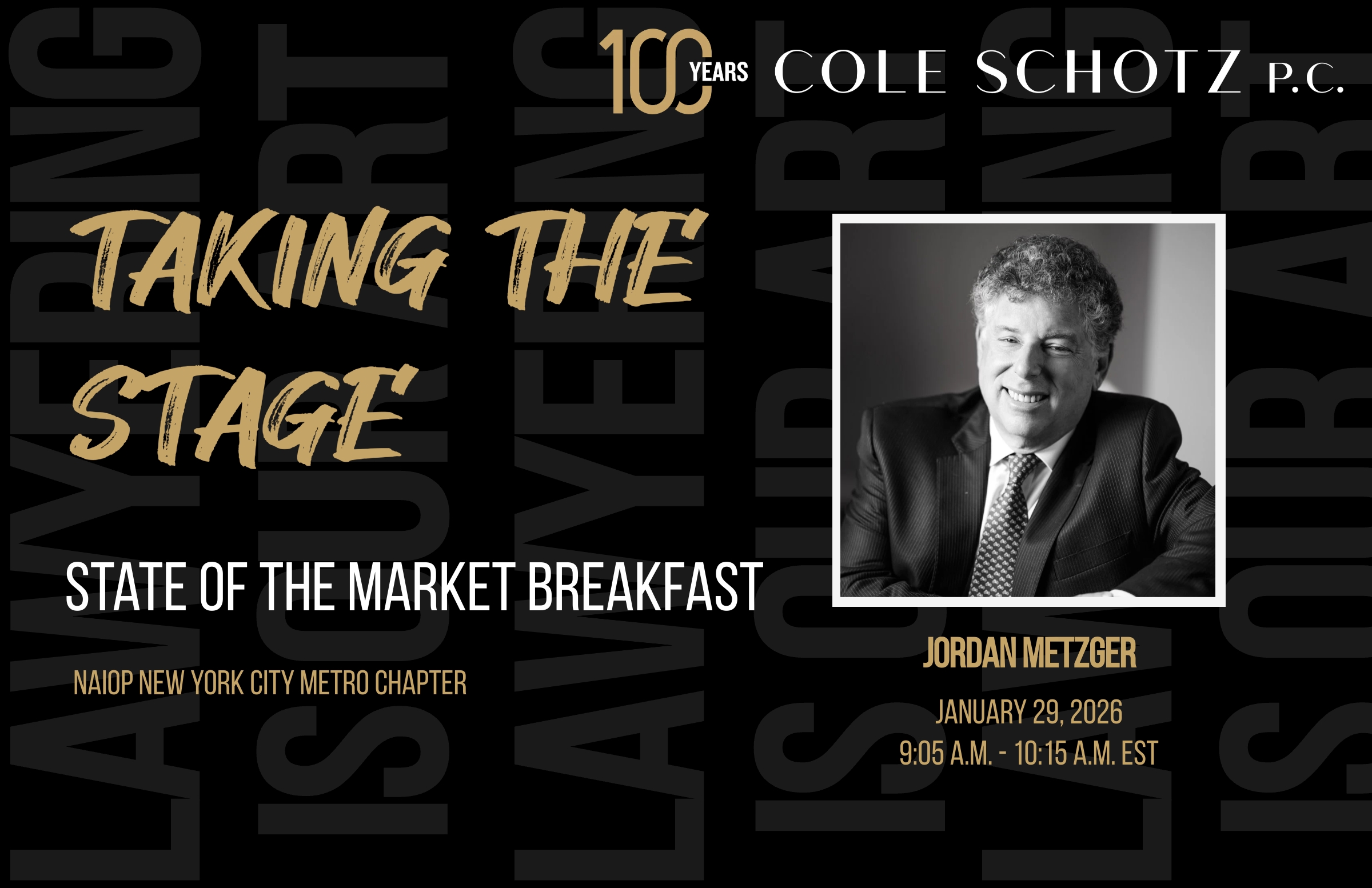 As the law continues to evolve on these matters, please note that this article is current as of date and time of publication and may not reflect subsequent developments. The content and interpretation of the issues addressed herein is subject to change. Cole Schotz P.C. disclaims any and all liability with respect to actions taken or not taken based on any or all of the contents of this publication to the fullest extent permitted by law. This is for general informational purposes and does not constitute legal advice or create an attorney-client relationship. Do not act or refrain from acting upon the information contained in this publication without obtaining legal, financial and tax advice. For further information, please do not hesitate to reach out to your firm contact or to any of the attorneys listed in this publication. No aspect of this advertisement has been approved by the highest court in any state.